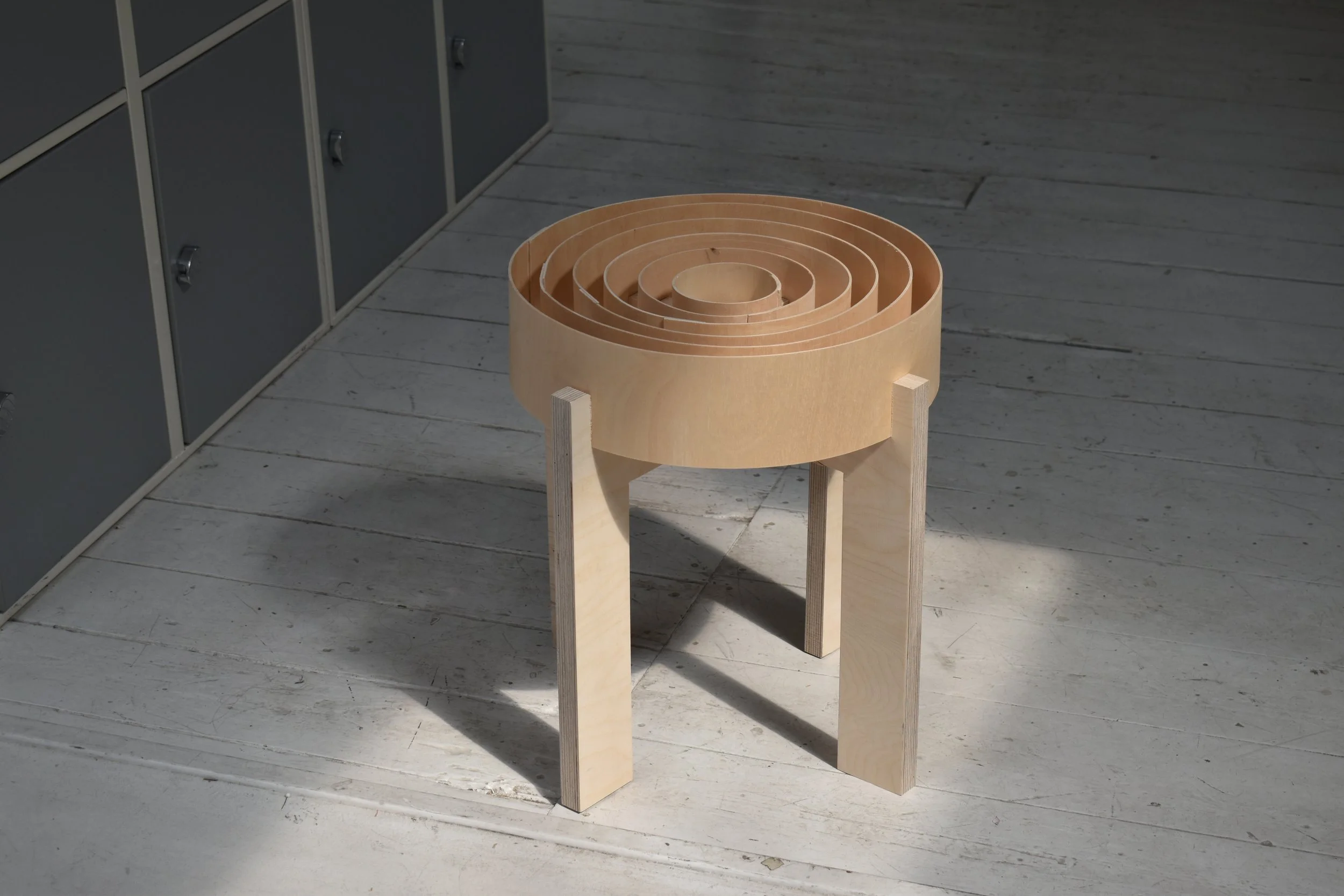 This stool is a conceptual study that was designed as a part of a furniture design program in Copenhagen, Denmark. It juxtaposes Danish minimalism with an innovative approach to pushing the structural boundaries of plywood.